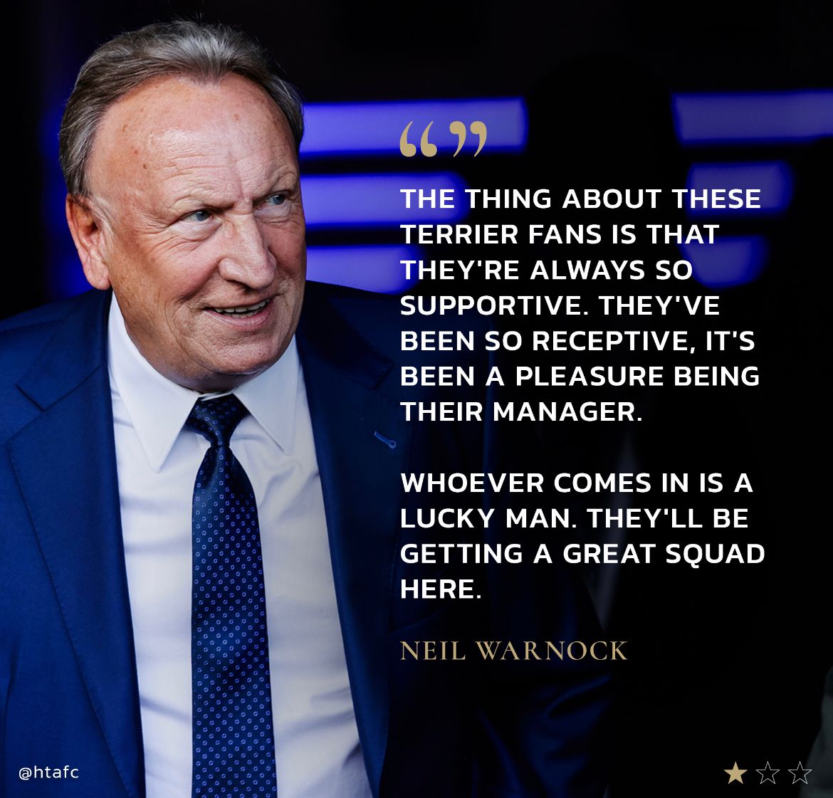 Another is Town manager Neil Warnock whose new suit has a special message in the collar which is arguably Neil’s greatest quote during a pep talk to his team: “You’ve got to die to get three points.”